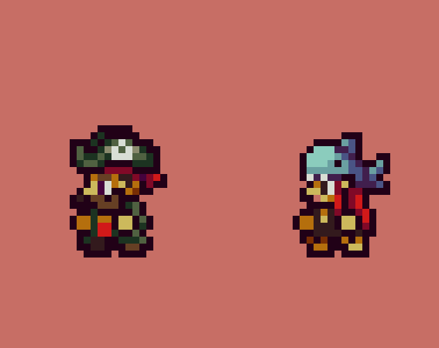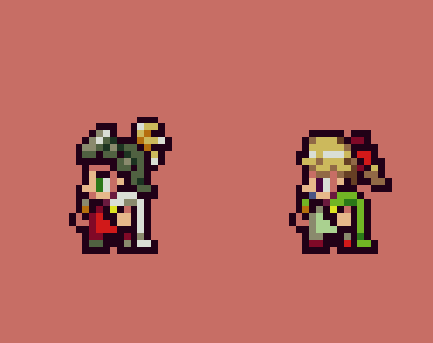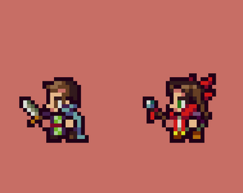 8 of them include 1 hero each with 32 sprites, size 24x32, all sideview. The ninth file includes a set of basic weapons for the attack animations.