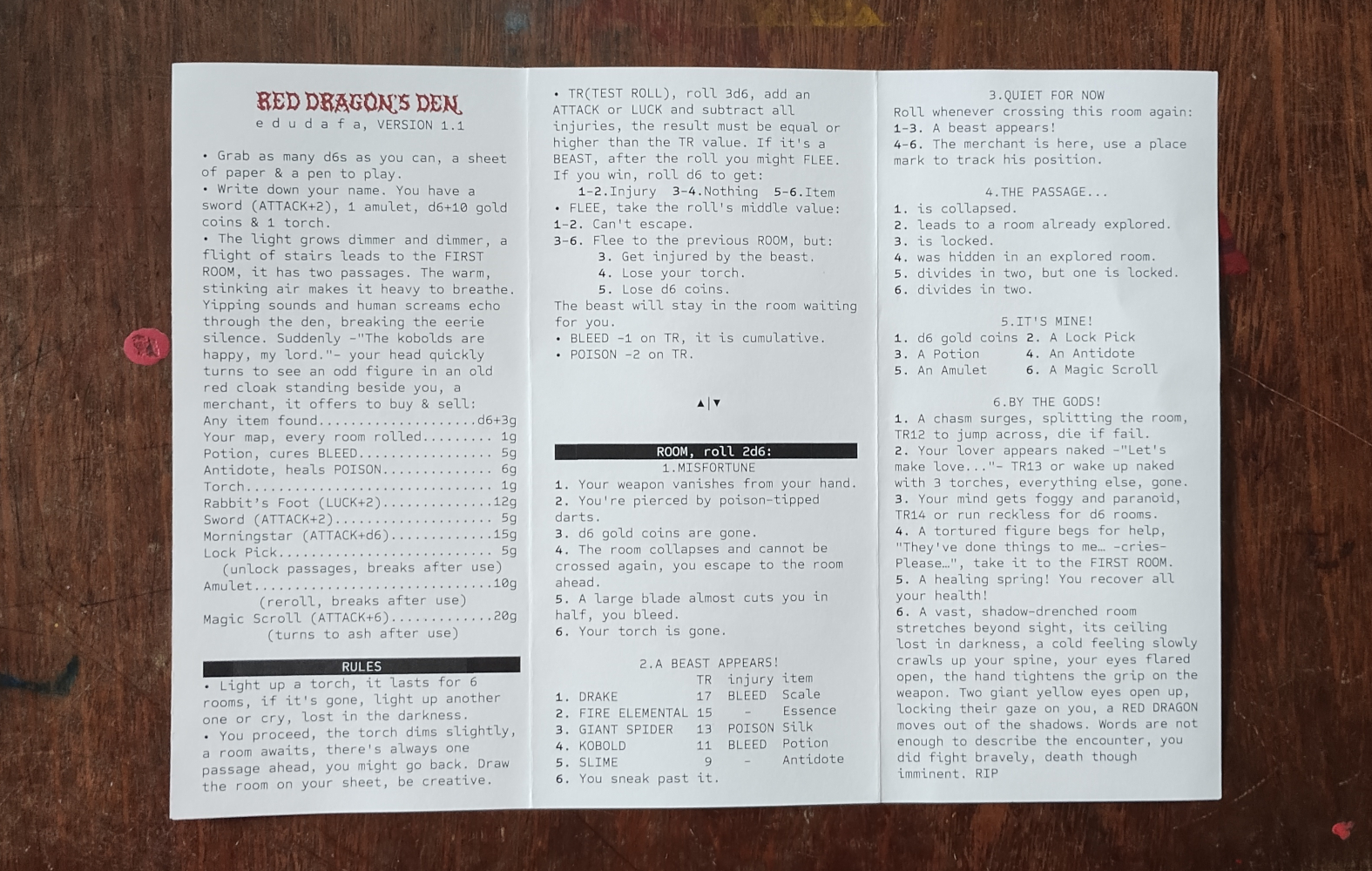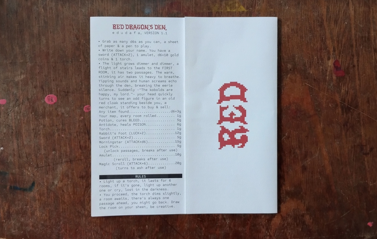 Red Dragon's Den is a single-page, fast-paced solo dungeon-crawling RPG, inspired by roguelikes, pen & paper, solo RPGs, dungeon crawlers, and the like.